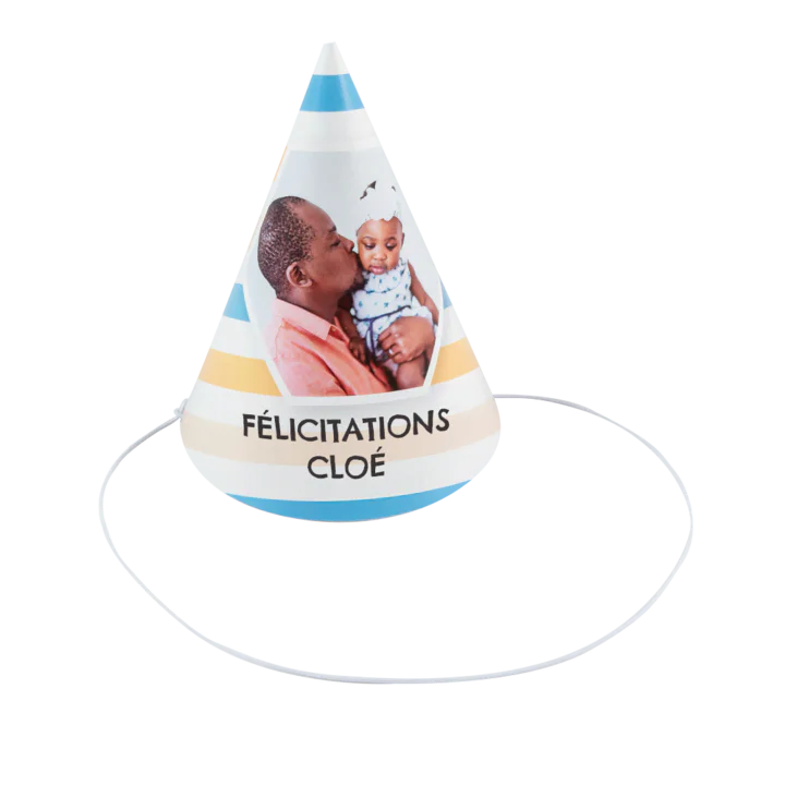 Apportez la touche finale à votre fête avec les chapeaux de fête personnalisés. Faies votre choix entre nos différents thèmes bébé et ajoutez un chouette photo ! Vous pouvez également commencer un projet vierge. Les chapeaux de fête sont livrés par lots de 8 pièces. Ils sont imprimés sur papier résistant et sont pourvus d'un adhésif double face qui vous permet de les construire vous-même facilement. Avec votre commande vous recevez également les 8 élastiques à fixer dans les trous prévus à cet effet.