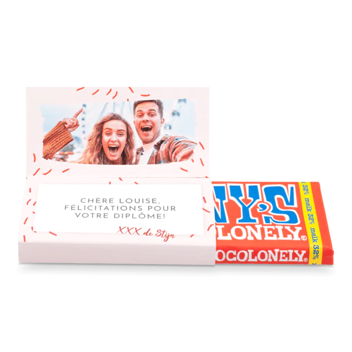 Le cadeau idéal pour les amateurs de chocolat ! Offrez à votre meilleur(e) ami(e), à un collègue ou à votre conjoint(e) une délicieuse barre de chocolat Tony Chocolonely avec un emballage personnalisé ! L’Éditeur en ligne vous permet de créer facilement votre barre de chocolat personnalisée. Choisissez entre nos différents projets prêts à l’emploi et ajoutez des photos et du texte. Ainsi vous pouvez créer un emballage unique en un clin d'oeil. Choisissez le goût, et vous pouvez commander !