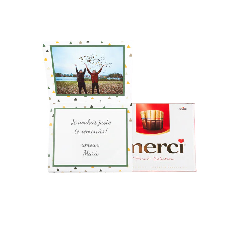 Offrir du chocolat c'est toujours une bonne idée, mais offrir des Chocolats Merci dans une boîte personnalisée, c'est encore mieux ! Ce cadeau rigolo est assuré de faire sourire quelqu'un. Choisissez une photo de quelqu'un en train de rigoler, d'un endroit que vous avez exploré ensemble, ou inscrivez un message émouvant sur votre boîte de Chocolats Merci. Afin de rendre votre design encore plus fun, vous pouvez y ajouter des clipart ou des thèmes. Faites un grand plaisir à quelqu'un avec une boîte de Chocolats Merci personnalisée !